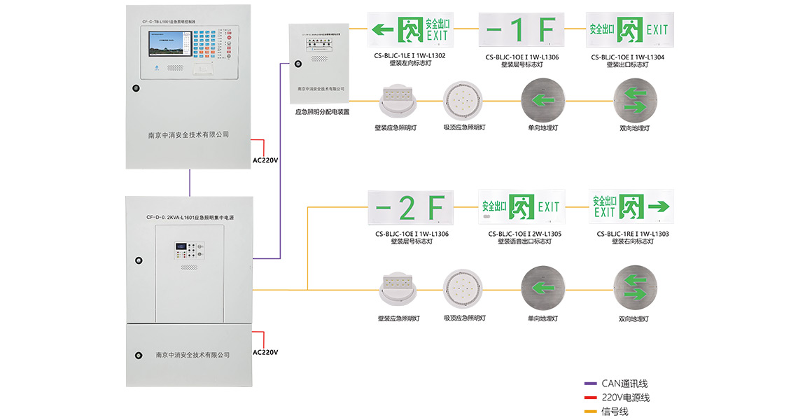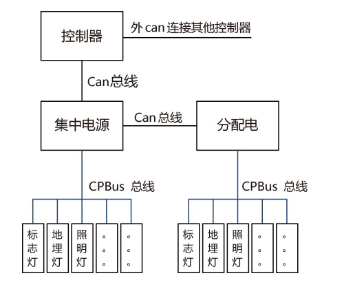應(yīng)急照明及疏散系統(tǒng)由控制器、集中電源、分配電裝置及各種燈具組成??刂破髋c集中電源、集中電源與分配電裝置均通過can總線相連,燈具掛接在集中電源或分配電上的CPBus總線上。